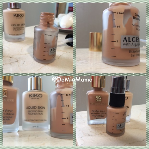 Eché primero el de Estée Lauder que es el oscuro y bastante mas denso que el de Kiko, y luego eche el clarito, la proporción que usé esta vez fue 25% del oscuro, 75% del clarito, (con la escala del bote es fácil controlar lo que pones de cada uno) y listo!!! Mi tono maquillaje para usar sin tener que mezclar varios maquillajes y encima con dosificador (que para las que usáis Estée Lauder sabéis el rollo que es echarlo sin dosificador), estaba preparado 🙂