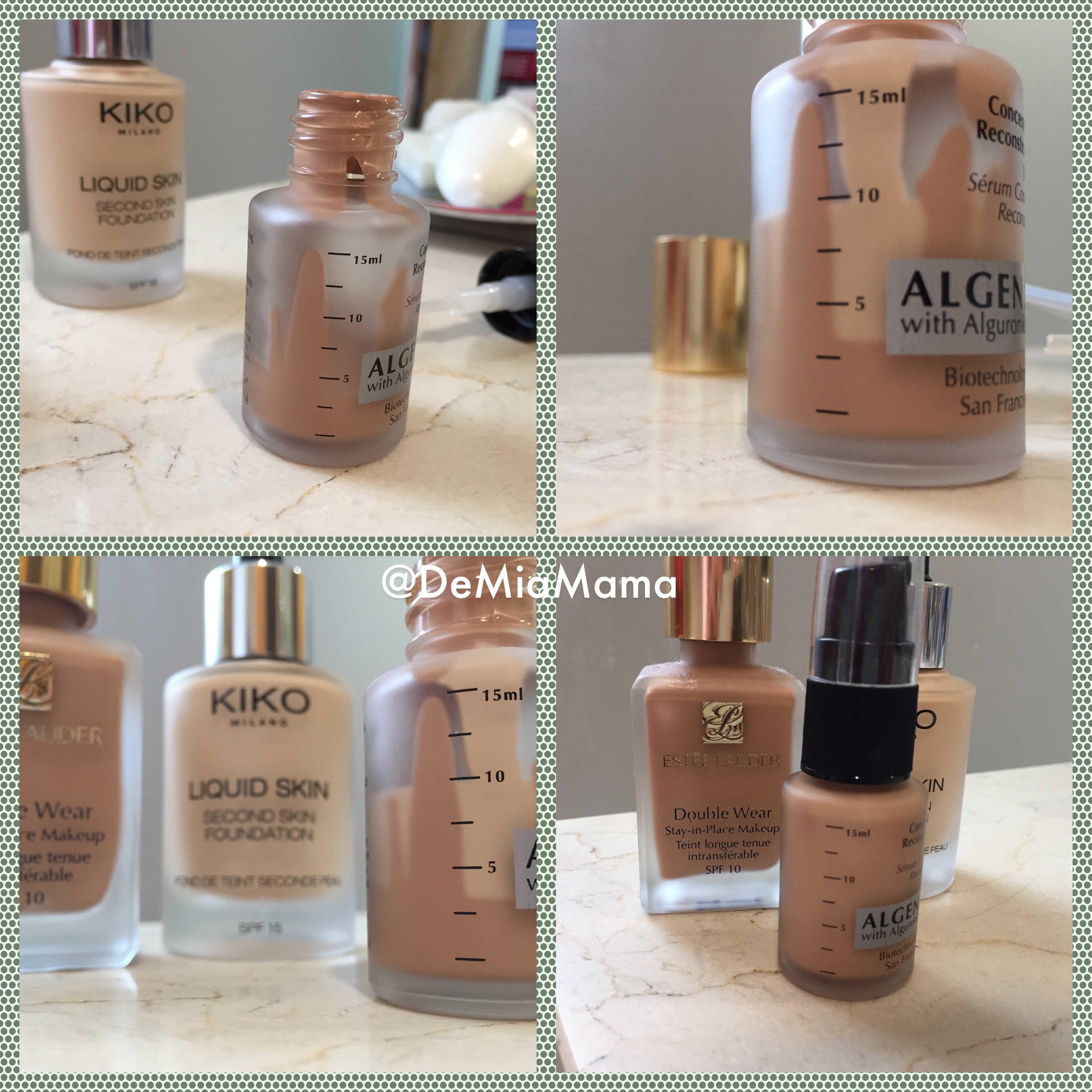 Comencé a utilizarlo, mezclándolo con uno de los míos oscuros en mi mano, pero por las mañanas el tiempo es oro y además cada día me salía una mezcla diferente, vamos que un día tenía blanco tipo nórdico y otro como se me fuese la mano con el oscuro, parecía que venía de las Islas Canarias. Tenía que buscar una solución y me puse a buscar en el baúl de los recuerdos y encontré un bote de serúm de Algenist que había guardado porque me parecía muy apañado, (tamaño pequeñito y con escala de medidas en el lateral) y me decidí a potinguear.