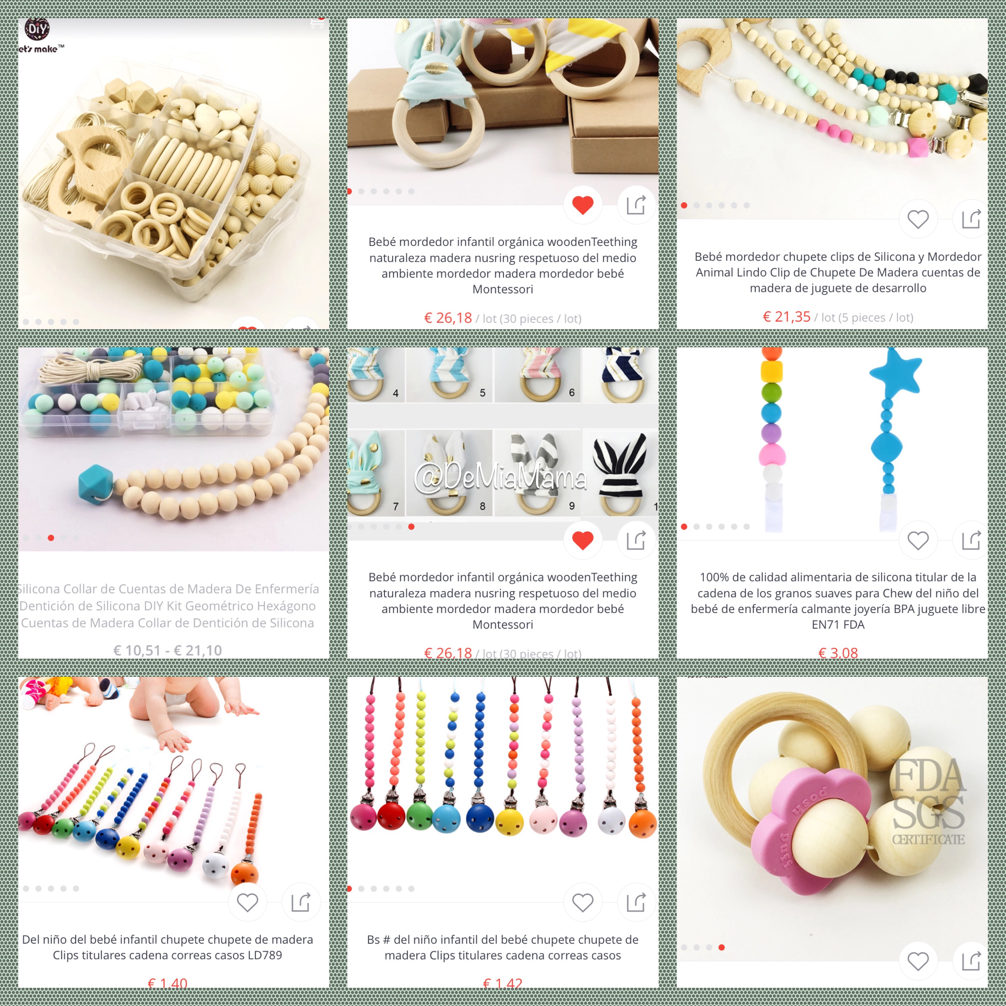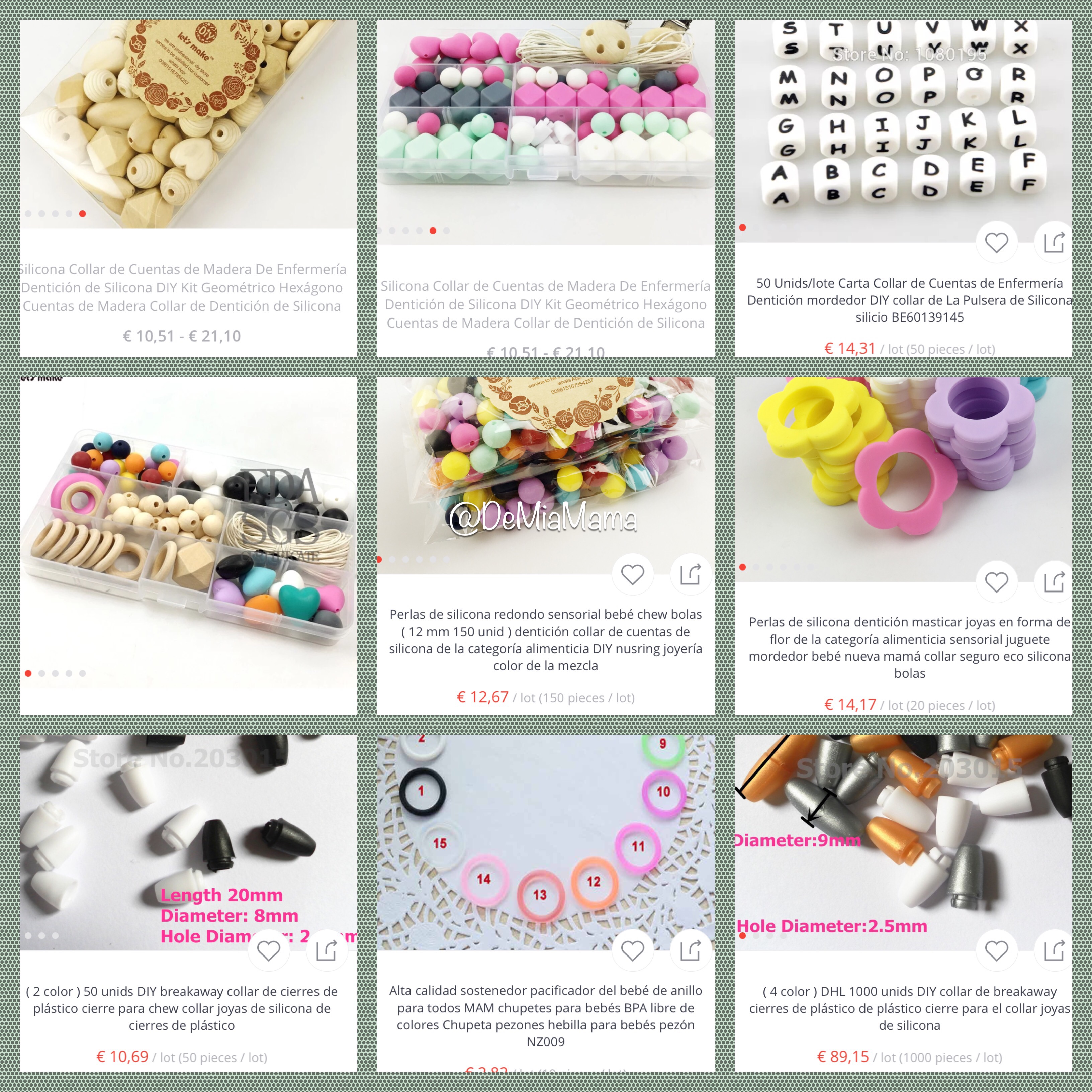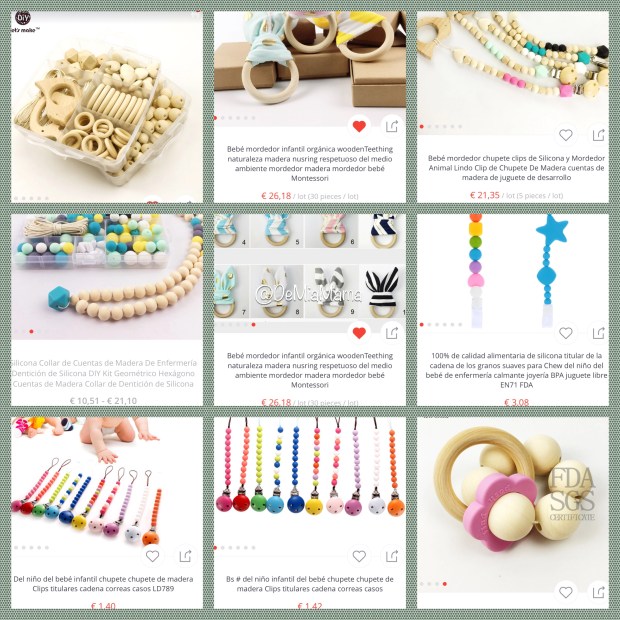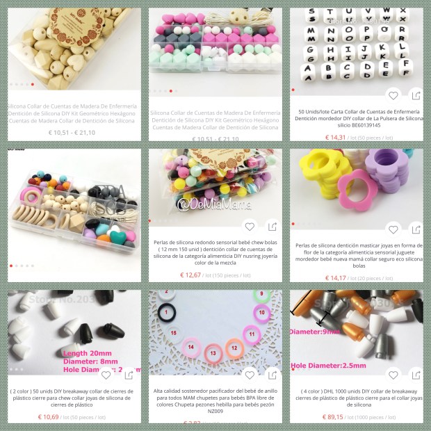 ¿Dónde nació mi preocupación? al verme perdida entre tropecientas tiendas, artesanas y demás que los venden, pero, ¿por qué me iba a preocupar eso??? pues comenzó a preocuparme en el momento que chafardeando por Aliexpres me encontré las cuentas de silicona con las que se hacen los collares, las de madera, los diferentes colgantes que se les ponen, los cierres… (y hasta los collares) por un ínfimo precio, así que ahora ¿a quién le compraba yo el collar que no me diese gato por liebre, o en este caso silicona certificada para uso de bebes por cuentas de Aliexpres???