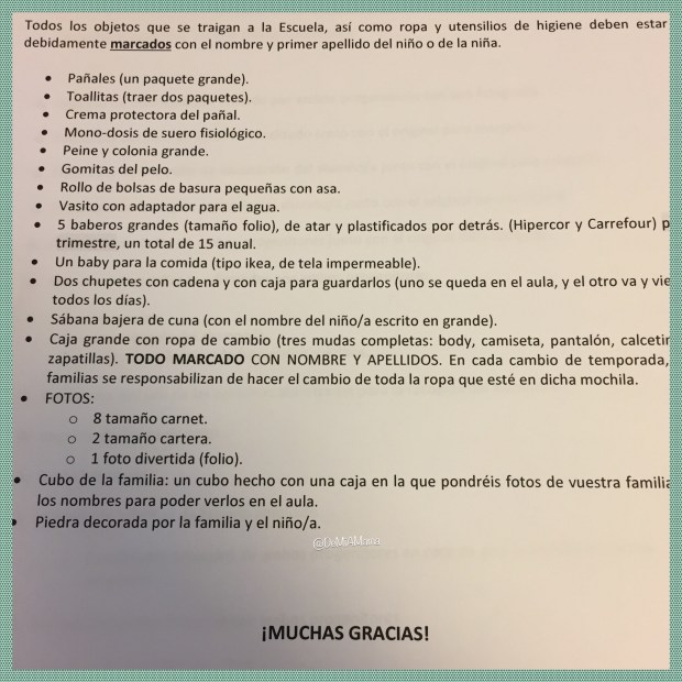 Y ahora comenzamos con la lista del herederoII, para que no me llaméis exagerada le he sacado una foto y para los que os preguntáis en qué tipo de escuela infantil piden esto pues os diré que es una escuela pública de la Comunidad de Madrid.